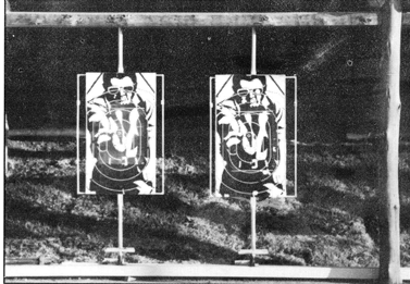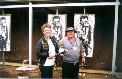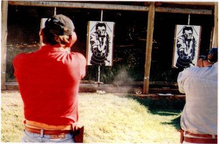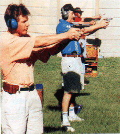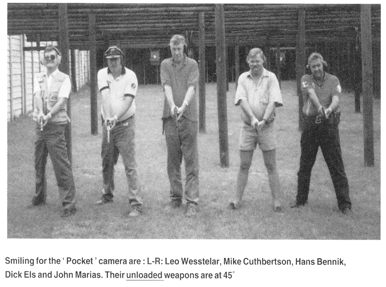 Between each series of shots the gun is unloaded and proved to the range officer tobe clear. On completion of each series the shooter moves to the next firing distance before scoring and patching. By far the best way to shoot either PPI or Pocket Pistol is at a club, shoulder-to-shoulder on turning targets, but there are other ways. You can use fixed targets and an electronic timer with an ear plug, or with no fancy equipment other than a Walkman type tape-recorder and a tape on which you have recorded times and instructions. A few buddies can shoot together if you have a competent range officer with a stop-watch and a whistle. Ear-muffs are essential. A holster, stop-watch, speed-loader and or a spare magazine are useful but not absolutely necessary. | |